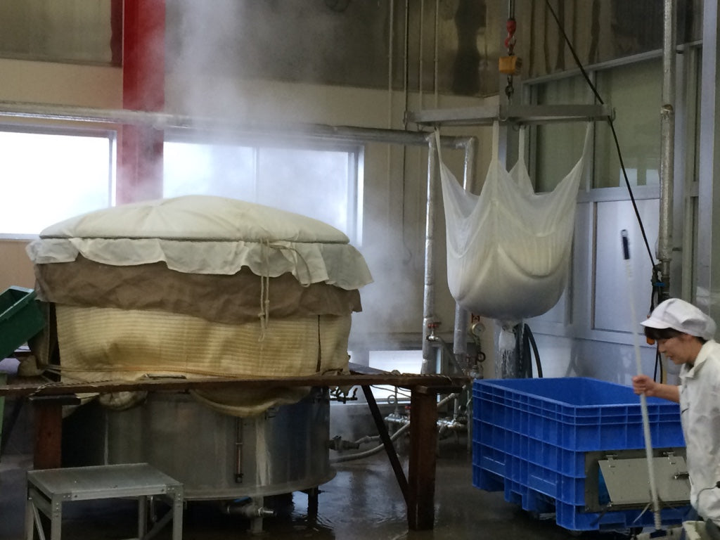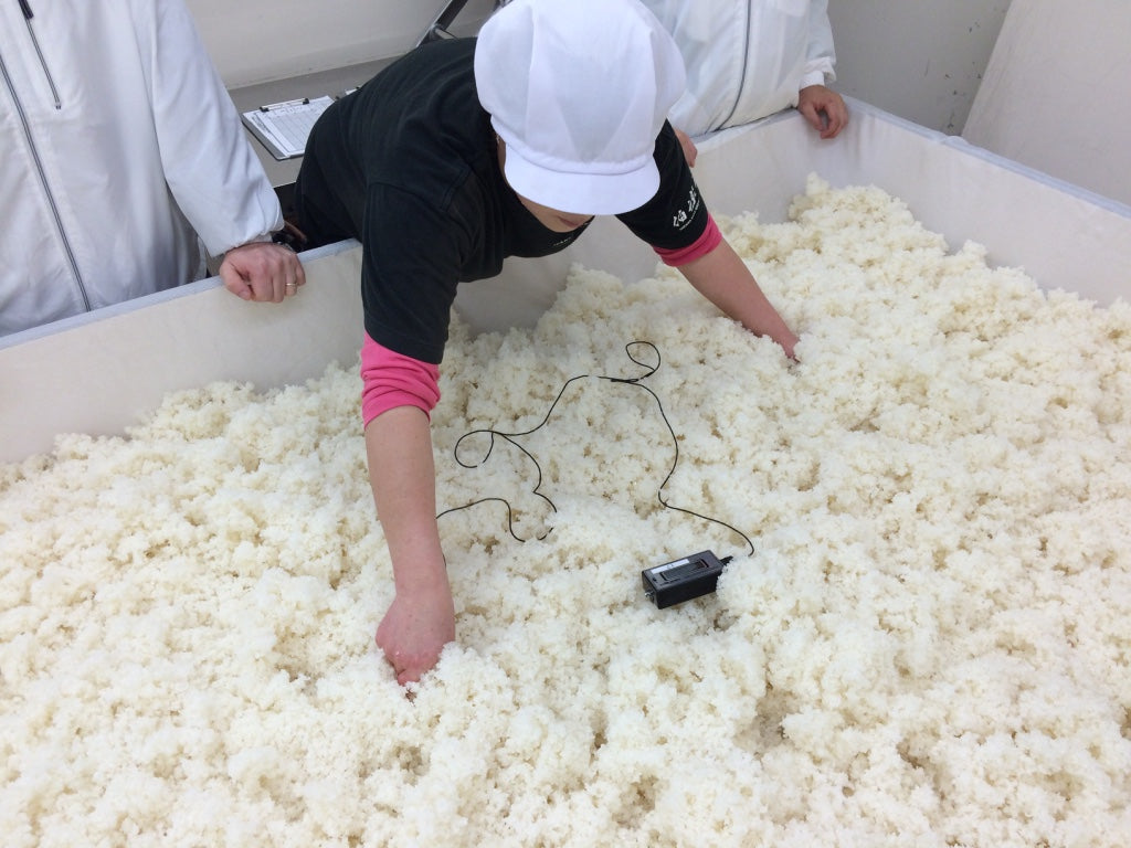 A gőzölt rizs 20-30%-át egy cédrusfával borított, meleg, 60% fölötti páratartalmú szobába szállítják, ahol egy asztalra terítik, és a koji-kin nevű penészgombával egyenletesen beporozzák.